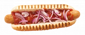 Состав: сосиска, лук красный, соус томатный, майонез французский, горчица