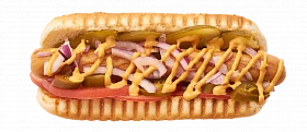 Состав: сосиска, огурец маринованный, помидоры, лук красный, халапеньо, горчица, соус томатный, соус чипотл