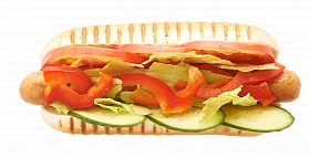 Состав: сосиска, помидоры, огурец свежий, перец болгарский, салат Айсберг, горчица, соус томатный, майонез французский