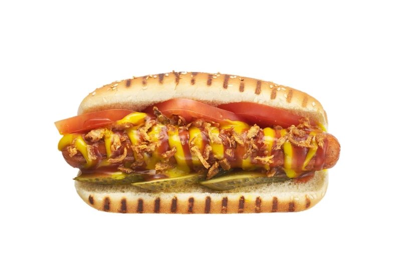 Состав: Сосиска, огурец маринованный, помидор свежий, фри лук, соус горчичный, соус 1000 островов