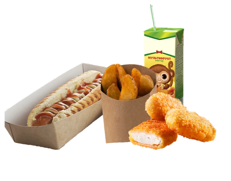 Состав:Хот-дог (булка, сосиска, кетчуп, майонез); Наггетсы 3 шт; Картофельные дольки 70 гр; Сок 0,2л
