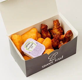 Состав набора: 5шт пряных крылышек, 10шт. куриных наггетсов+соус на выбор