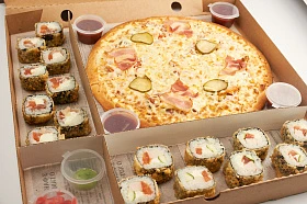 Состав набора: Пицца Сочный бекон (круг 4 порции) Ролл Темпура с беконом 8 шт Ролл Темпура с курицей 8 шт Соус томатный 4 шт Имбирь 1 порция Васаби 1 порция Соевый соус 2 порции