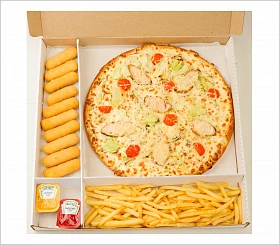 Состав набора: Пицца Цезарь 4 порции / сырные палочки 10 шт / картофель фри 200 гр / соус Хайнц 2 шт
