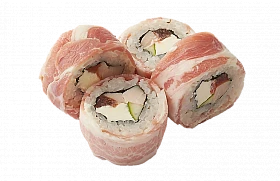 Рис, нори, курица, помидор, огурец свежий, сыр сливочный, бекон