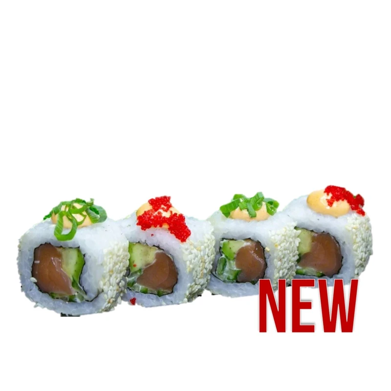 Состав: Рис, нори, лосось, авокадо, огурец свежий, лук зеленый, икра масаго, соус спайси, соус пикантный