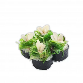 Состав: рис, нори, сыр сливочный, креветка, чукка, соус ореховый, лепестки миндаля