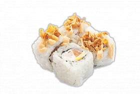 Рис, нори, сыр чеддр, лосось, креветка, сыр сливочный, соус спайси, лук фри
