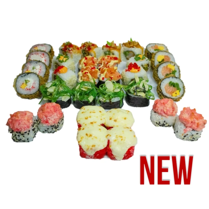 Футзи спайси 4 шт, Нежный лосось 4 шт, Кендзо с крабом 4 шт, Тайский 4 шт, Запеченная Калифорния чизи 4 шт, Запечённый Лава 4 шт, Темпура с лососем 4 шт, Темпура с крабом 4 шт ИТОГО: 32 шт ИМБИРЬ, ВАСАБИ, СОЕВЫЙ СОУС ЗАКАЗЫВАЮТСЯ ОТДЕЛЬНО!